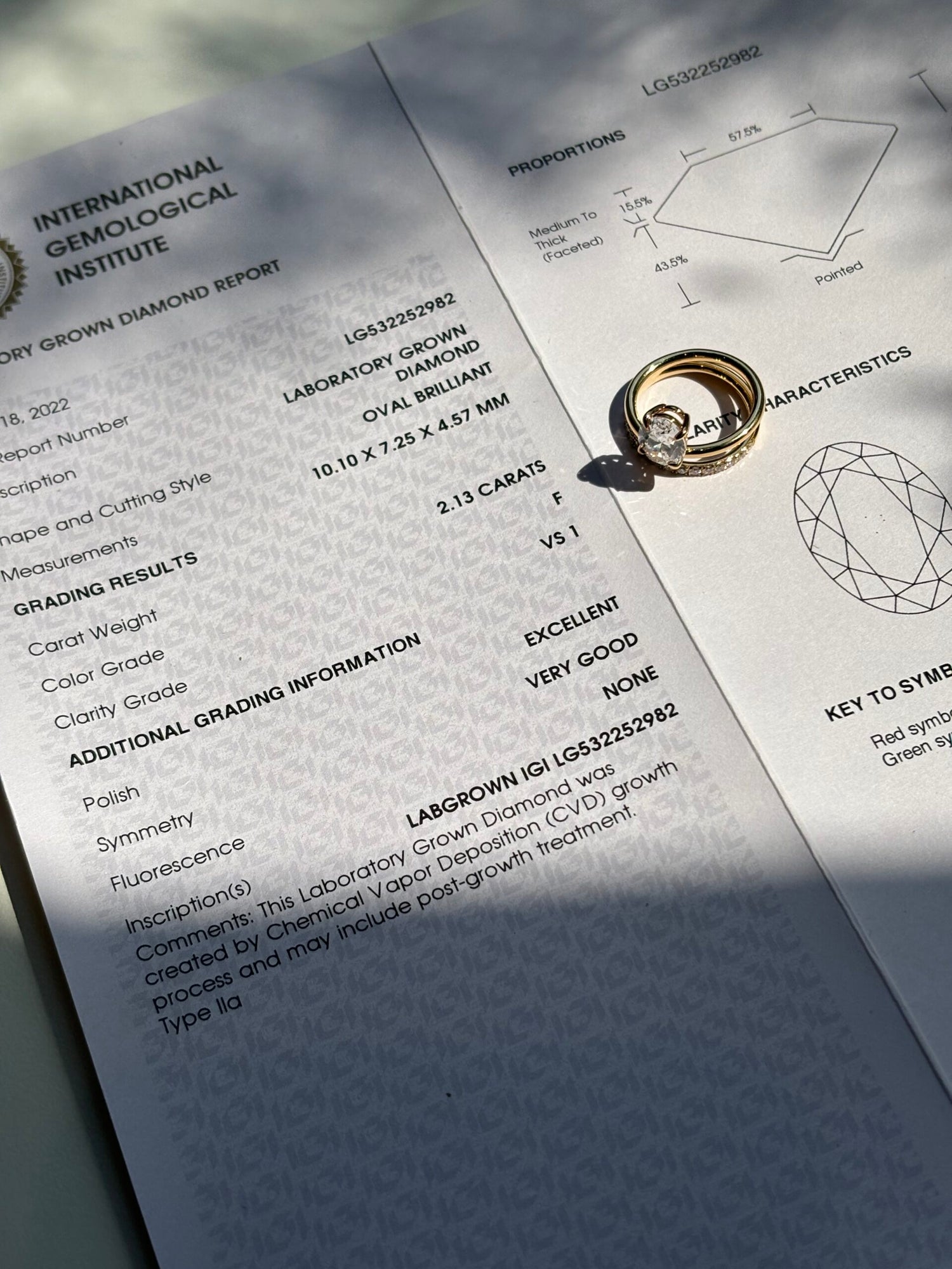 All our solitaires over 1 carat are IGI (International Gemological Institute) certified. The IGI certification confirms the diamonds, the sizing, the clarity, and cut which can be tracked online or through the certificate hard copy we provide.